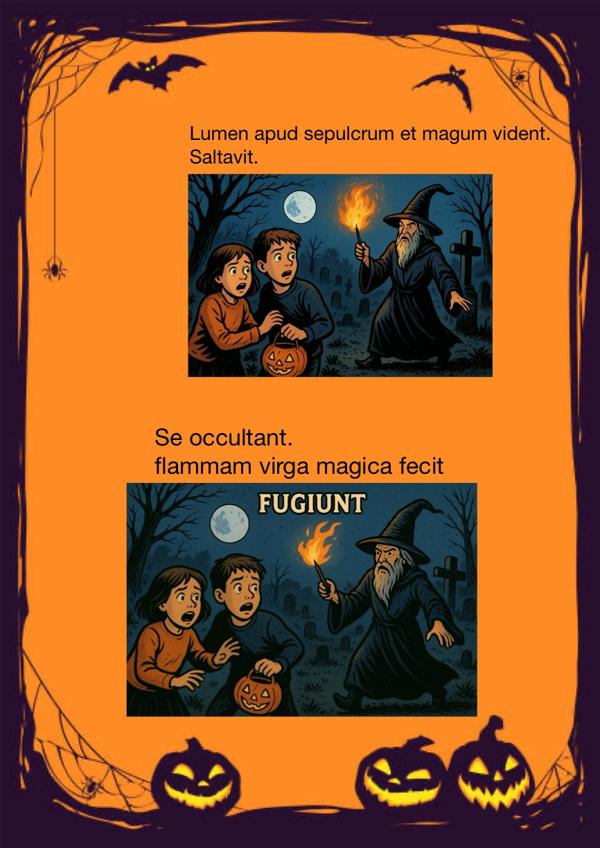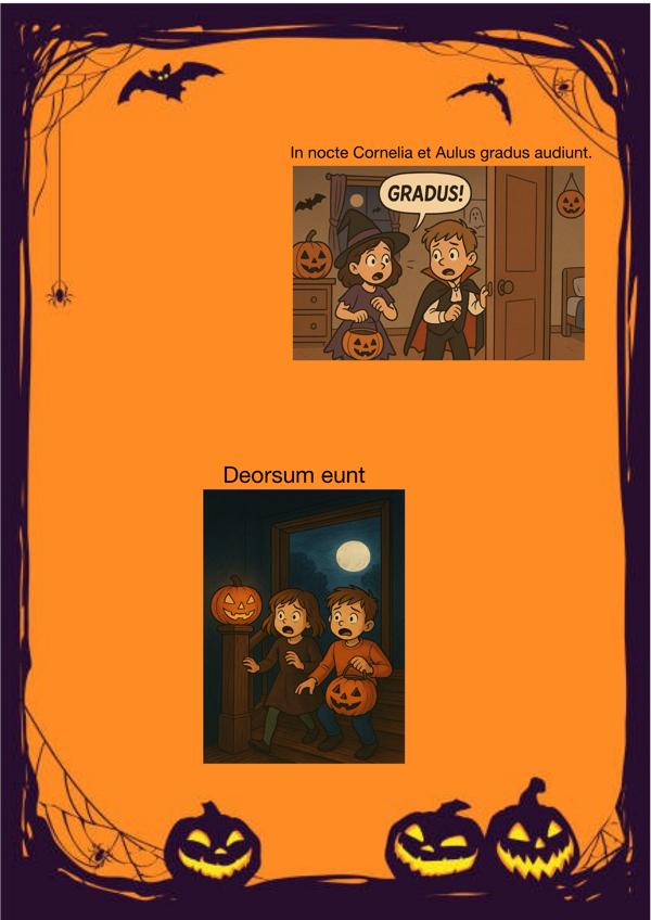 NIEDERAULA. Am 31.10.2024 war es wieder einmal so weit: Die Lateinschüler/-innen der Gesamtschule Niederaula haben wieder ganz kreative und tolle Ergebnisse beim Latein-Wettbewerb zu Halloween erstellt und eingereicht. Man konnte Comics, Mem-Bilder, Gruselgeschichten und Gedichte einreichen. Alles natürlich auf Latein, kreativ und lebhaft. Auf diese Weise stellten gleich fünf Schüler/-innen der Jahrgangsstufe 7, die gerade erst mit ihrem ersten Lernjahr Latein begonnen haben, ihre Lateinkenntnisse unter Beweis. In der Gruselgeschichte von Marit Stock (G7b) und Clara Schmidt (G7b) hört Aulus, ein römischer Junge aus den Lektionstexten, nachts im Garten einen Raben, der Wind geht und es ist eine furchtbare Nacht. Als seine Schwester Cornelia ins Atrium der Villa hinzukommt, meinen beide, dass in der Küche des Hauses ein Monster unterwegs sei. Als dann plötzlich der Vater aus der Küche tritt, löst sich der Spuk mit einem Lachen auf. Genauso gruselig und lustig zeigte sich auch die Halloween-Geschichte von Marie Otterbein (G7a), in der Aulus nachts bei seinem Snack durch Geräusche an der Tür gestört wird. Als er hinaustritt, begegnet er angstvoll gruseligen Gespenstern, bis er erkennt, dass es verkleidete Kinder sind. Ein kreatives Highlight war dann der selbst gezeichnete Comic von Lene Rathke (G7b) und Greta Bieber (G7b), weil er unter anderem in ein selbst origamigefaltetes Buch geschrieben wurde. In ihm erlebt Aulus eine besonders schaurige Nacht, in welcher er von seiner Schwester Cornelia, die zum Monster mutiert ist, bis auf einen Friedhof verfolgt und dort angegriffen wird. Aber zum Glück wacht Aulus an dieser Stelle auf und merkt, dass alles ein böser Traum war.