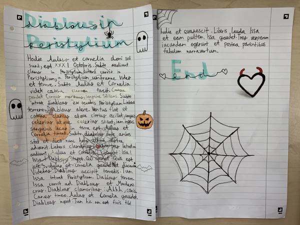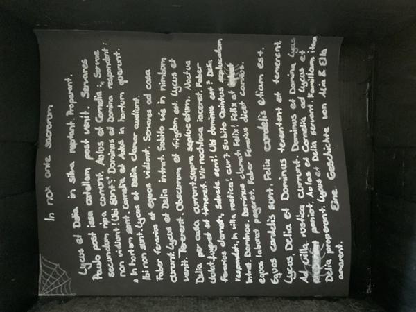 In den eigenen Gruselgeschichten der Siebt- und Achtklässler erleben Cornelia und Aulus, die Geschwister der römischen Lehrbuchfamilie, meist überraschende Wendungen, indem sie ihr Hündchen Issa fälschlicherweise für eine Gespenst halten, welches nachts in der culina (=Küche) ein Würstchen klaut oder im peristylium (= dem kleinen Hausgarten mit Säulengang) Vögel jagt. Manchmal begegnen die römischen Geschwister auch Orakeln oder Magiern oder einfach nur verkleideten Kindern, die „Süßes oder Saures“ rufen. In einem besonders, gerade auch sprachlich-grammatisch gelungenen Comic der Jahrgangstufe 7, von Finn Lochhaas und Mats Landsiedel, denkt ein Schlossbesitzer, dass ein Haus in Brand gerät und muss erkennen, dass es nur ein Trugbild war, welches vom Zauberer weggezaubert wird. Dies wurde auch mit dem ersten Platz für Comic ausgezeichnet. Ein kreatives Highlight war dann der von Ella Krause und Mia Sofie Glebe (beide Jgst. 7) gefertigte, schwarze Schuhkarton im Stil von Halloween, in welchem eine spannende Geschichte von einer Odyssee durch einen nebligen Wald geschrieben steht. Diese Geschichte bekam den ersten Platz für Kreativität. Die sprachlich-grammatisch beste und auch längste Geschichte der Jgst. 7 hat mit dem ersten Platz Lia Knaus belegt. Hier ist Issa das Hündchen die Heldin der Geschichte, die ganz tapfer Cornelia und Aulus verteidigt. Lenja Stein und Anna Karstädt erhielten den ersten Preis in der Kategorie Gedichte der Jgst. 7. In Jahrgangstufe 8 erhielt den ersten Platz für große Kreativität Luis Trebtau und der erste Platz im Bereich Grammatik und Sprache ging an Christian Schuchardt und Pepe Gutberlet.