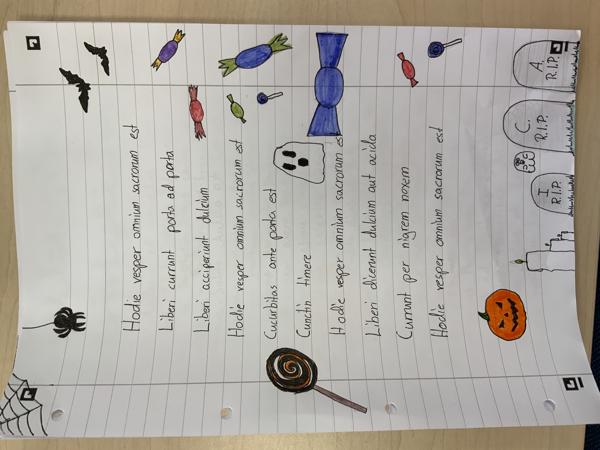Magarum nox, vesper omnium sanctorum - Am 31.10.2022 war es wieder einmal so weit: Die Latein-Schüler/-innen der Gesamtschule Niederaula haben wieder am Halloween-Wettbewerb teilgenommen und haben einmal mehr unter Beweis gestellt, dass Latein keine tote Sprache ist. Denn alle Gruselgeschichten, Gedichte und Comics zum Thema „Hexen, Zauberer & Gespenster“ wurden auf Latein verfasst und gestaltet. Hierbei gab es wieder viel zu erleben: Ob Kinder auf dem Lollsfest einer Hexe begegnen oder in der Lehrbuchfamilie gespenstische Tricks gespielt werden. Aber auch ein Monster wird in einer Gruselgeschichte von Kindern in Kostümen erschreckt oder Obelix in einem selbst gemalten Comic von Römern überrascht. Sogar Hedwig und Dobby haben in einem Comic Harry, Hermine und Ron einen Halloween-Streich gespielt. In einem lateinischen Rondell-Gedicht wird die Nacht der Hexen und Zauberer lyrisch beschrieben. Es gab also auch in diesem Jahr ausgelobte Preise für die beste sprachliche Umsetzung auf Latein, für die beste Kreativität und die beste thematische Umsetzung. Die Preisträger/-innen sind in diesem Durchgang aus Jahrgangstufe 8 gekommen: Emma Juli, Emily Stein, Nico Scheidemantel, Marius Dickel, Marlon Knoch und Lina Schmalzl. Sie alle erhielten ihre Preisauszeichnungen am 07.11.2022 von Lateinlehrerin Frau Aust und ihre Werke können von allen an der Latein-Wand im Foyer der Schule erlesen werden. Da kann man sich schon auf den Weihnachtswettbewerb freuen.
